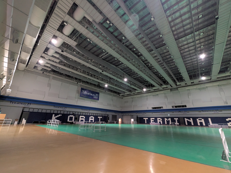 4階の朝食会場の外で軽くミーティング。その奥には、開店前のショッピングモール。しかも、同じ階にコンベンションホールがあり、そこがバスケ会場だよ。だからホテルも変更に?ということで、ホテルと大会会場が同じ施設内で、移動もなくて助かる。試合観戦も買い物も各自自由だし、全てがここで完結する便利さ。