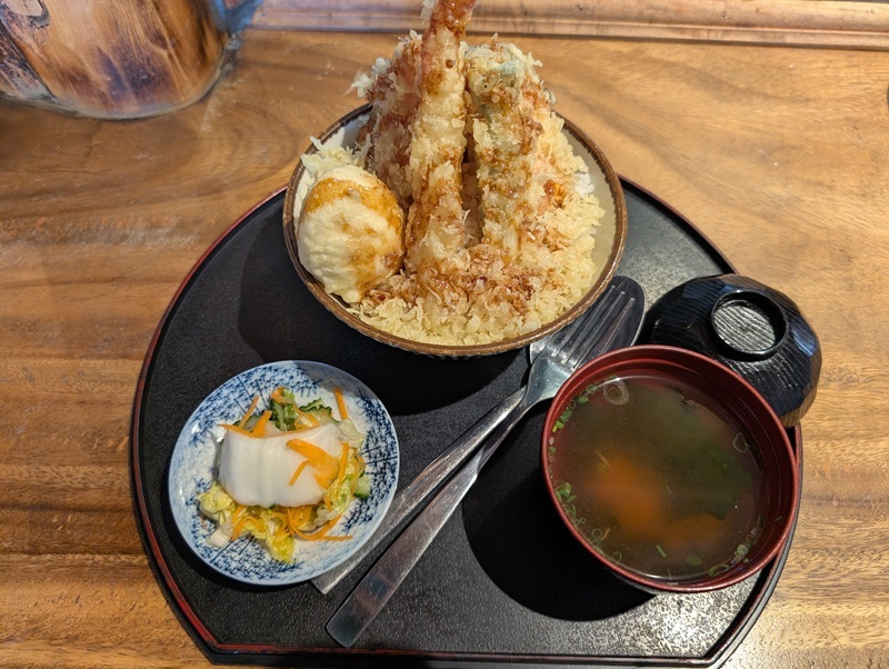 天丼を注文したら、少し違和感はあるものの、味は日本の味に近い。150,000LAK(約1,050円)だけど、みそ汁と漬物も付いてきた。また、キッチンではラオス人の板前が、サバをおろしたりピンセットで小骨を取り除いたりしてた。ビエンチャンの日本食レストランは、結構レベルが高いと思う。
