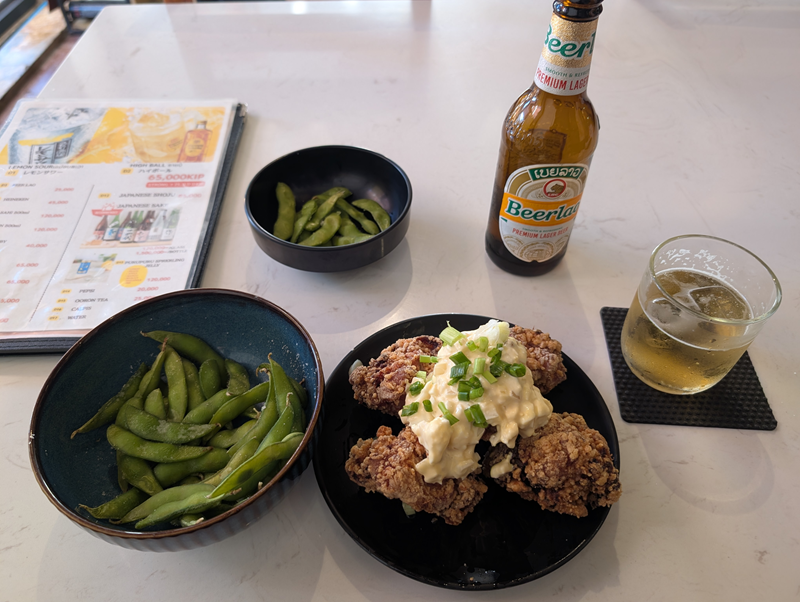 今日も昼メシはスキップで、夜はラオス人オーナーの居酒屋で晩酌。ビール小瓶2本、唐揚げのタルタルソース、枝豆で170,000LAK(約1,200円)。日本人感覚からすれば、決して高くないけど、現地の人にとったら高い。ただ、ボランティアできてるとは言え、自分自身が現地の生活レベルに、合わせる必要はないと思う。贅沢する気はないけど、必要以上に控える理由もないから。